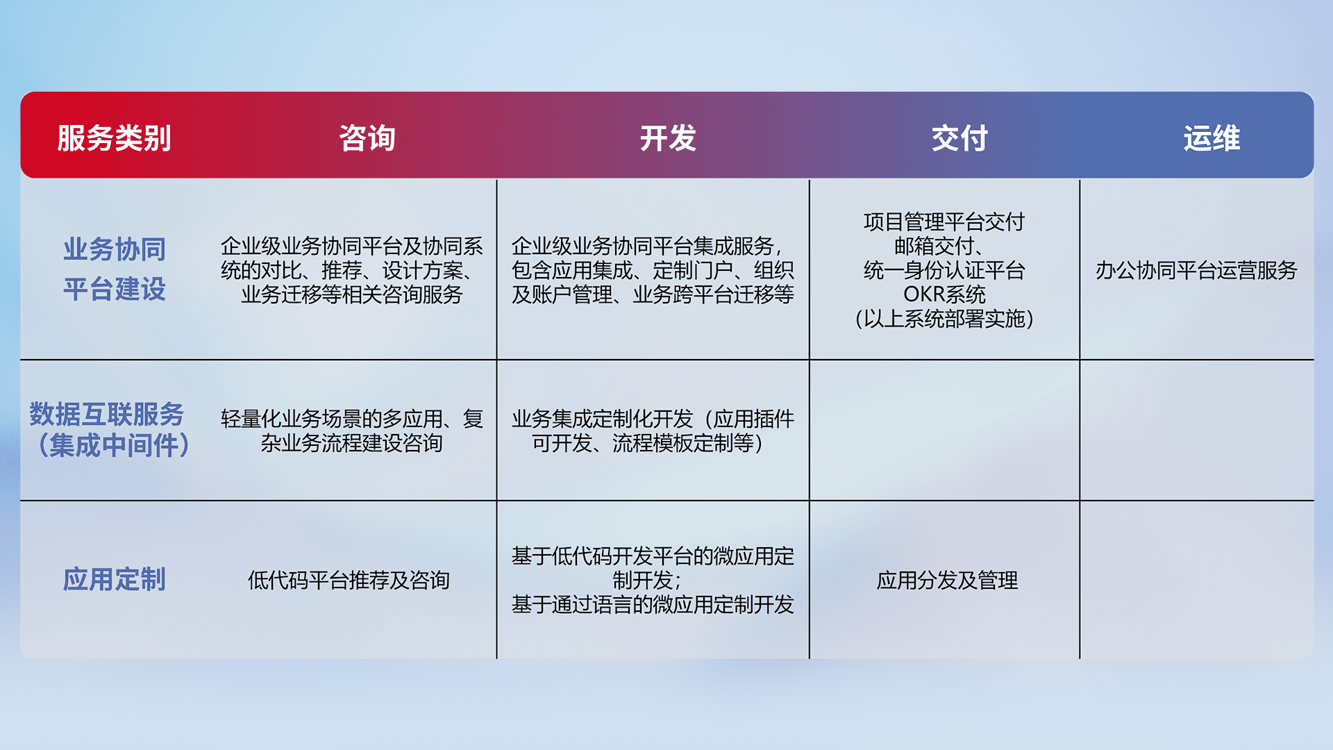 针对钉钉、、、、企微、、、、IDaas等平台级产品提供产品的规划、、、方案、、交付、、、定制化开发等服务,,,实现如统一协同办公、、智能客户服务、、、、混合会议管理、、、智能数据查询、、等业务场景,,实现数字化转型。。。。