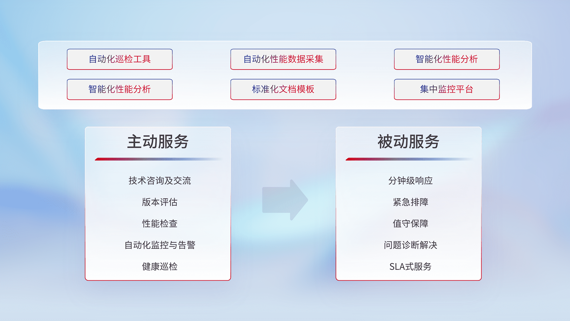 智能化工具和标准化文档,,保障服务质量,,提供主动服务(包含技术咨询、、版本评估、、、性能检查、、、自动化监控与告警、、健康巡检)和被动服务包含(分钟级响应、、、、紧急排障、、、值守保障、、、问题诊断解决、、SLA服务)。。